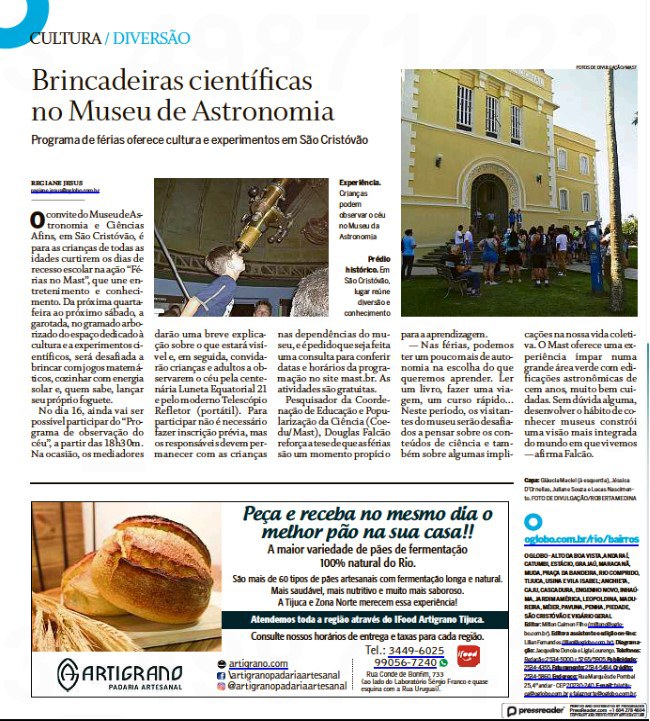 O Globo Tijuca + Zona Norte - Férias no MAST na reportagem "Brincadeiras científicas no Museu de Astronomia"