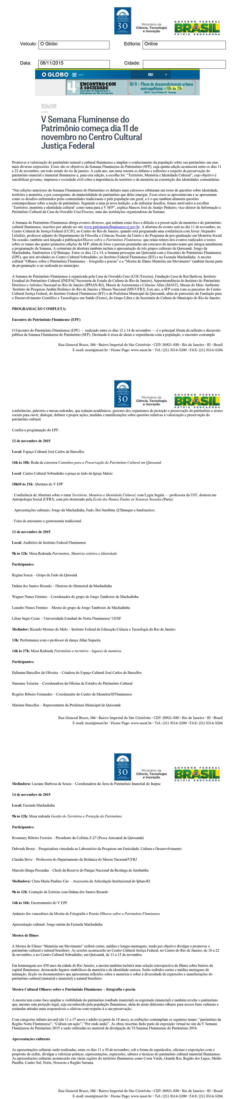 O Globo | V Semana Fluminense do Patrimônio começa dia 11 de novembro no Centro Cultural Justiça Federal