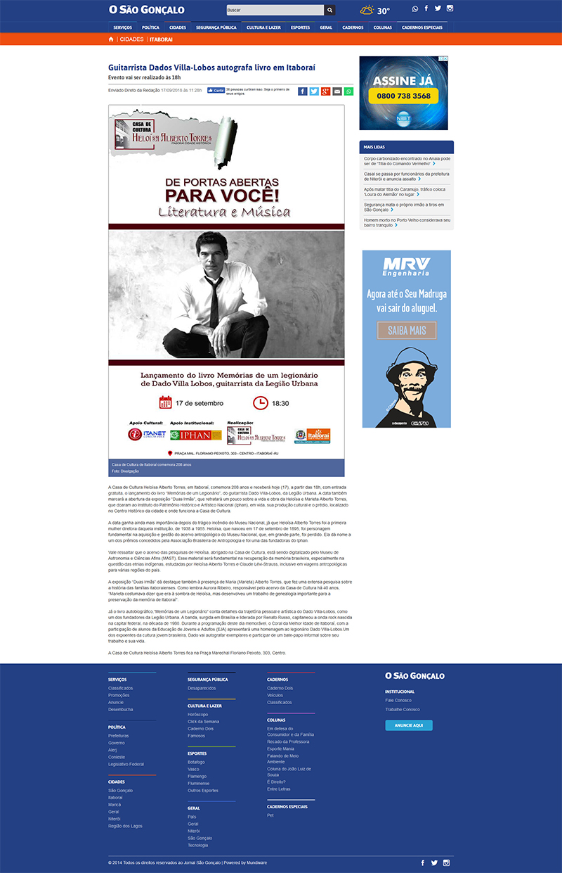 O São Gonçalo | Lançamento do livro Memórias de um legionário de Dado Villa Lobos, guitarrista da Legião Urbana
