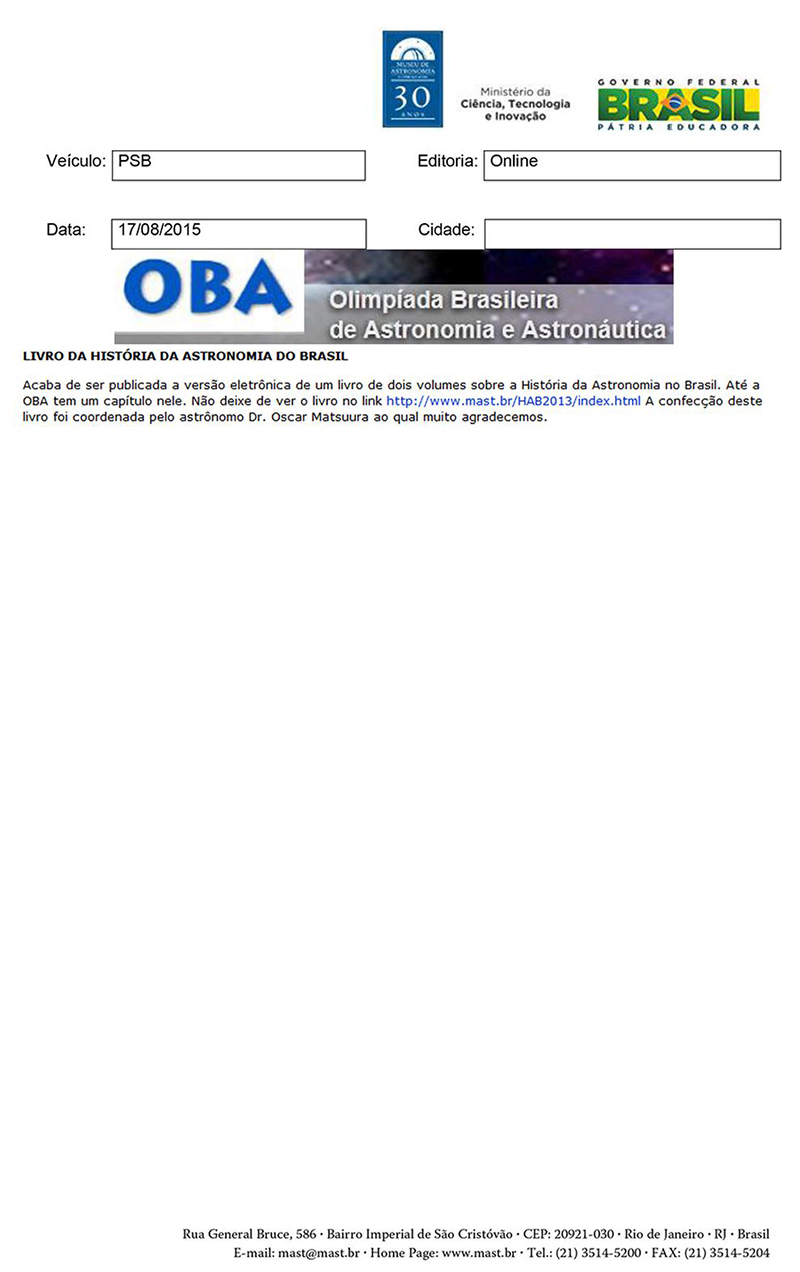 OBA | Livro da História da Astronomia do Brasil