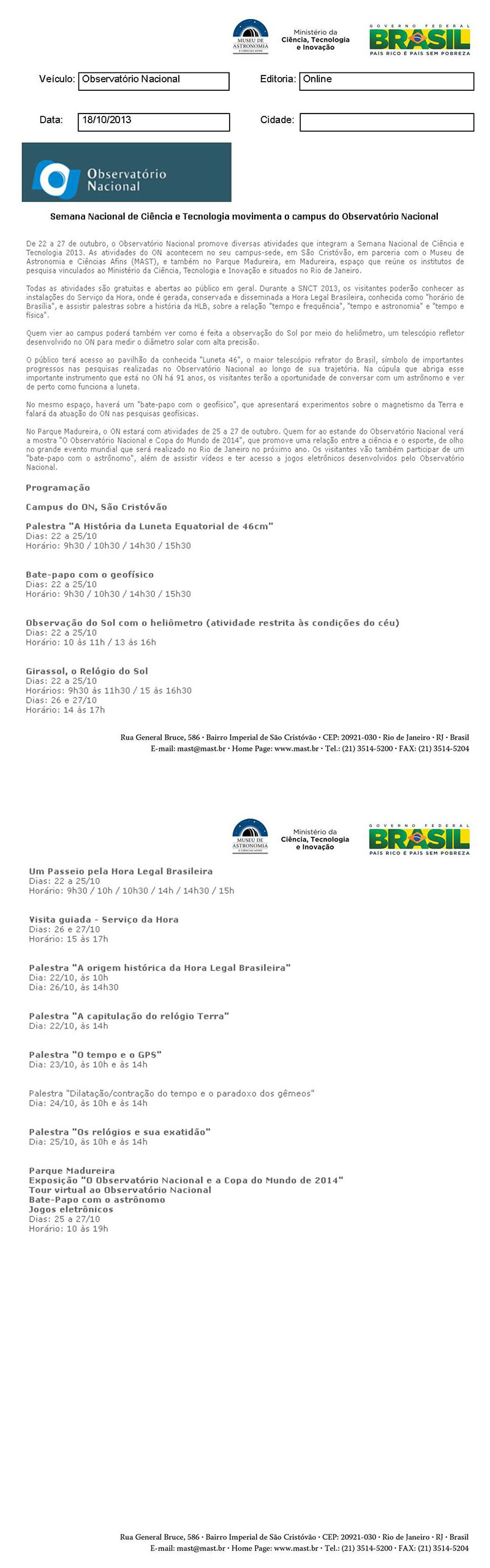 Observatório Nacional | Semana Nacional de Ciência e tecnologia movimenta o campus do Observatório Nacional