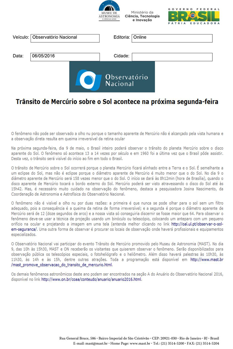 Observatório Nacional | Trânsito de Mercúrio sobre o Sol acontece na próxima segunda-feira