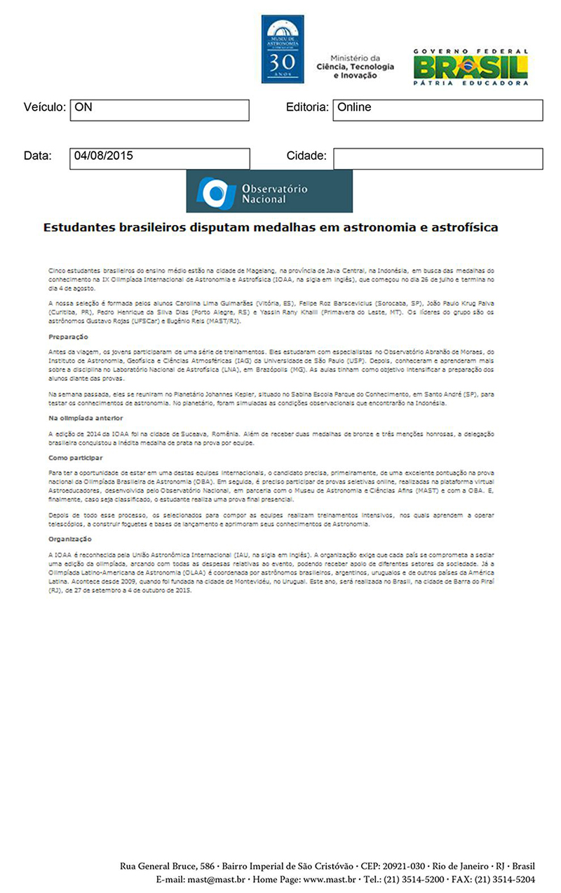 ON | Estudantes brasileiros disputam medalhas em astronomia e astrofísica