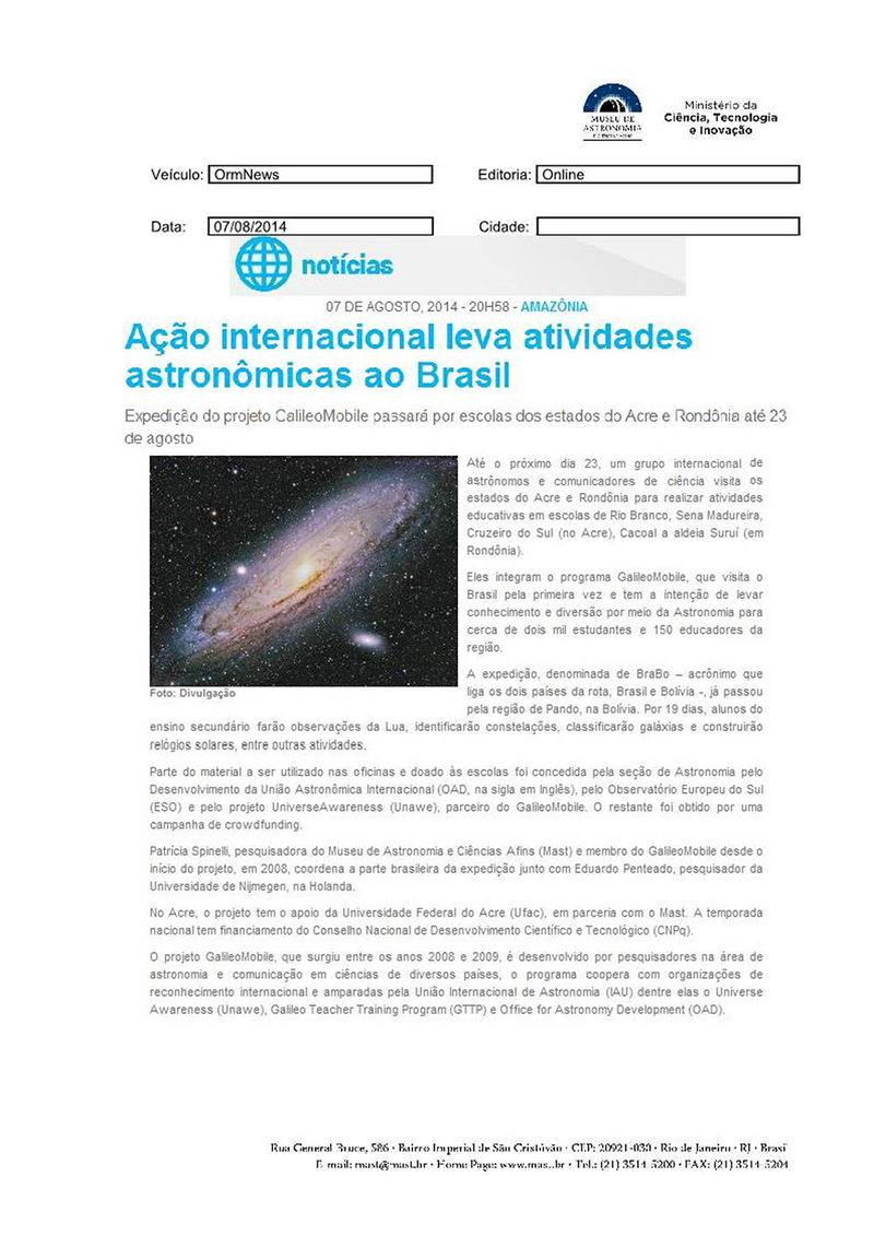 ORM News | Ação internacional leva atividades astronômicas ao Brasil