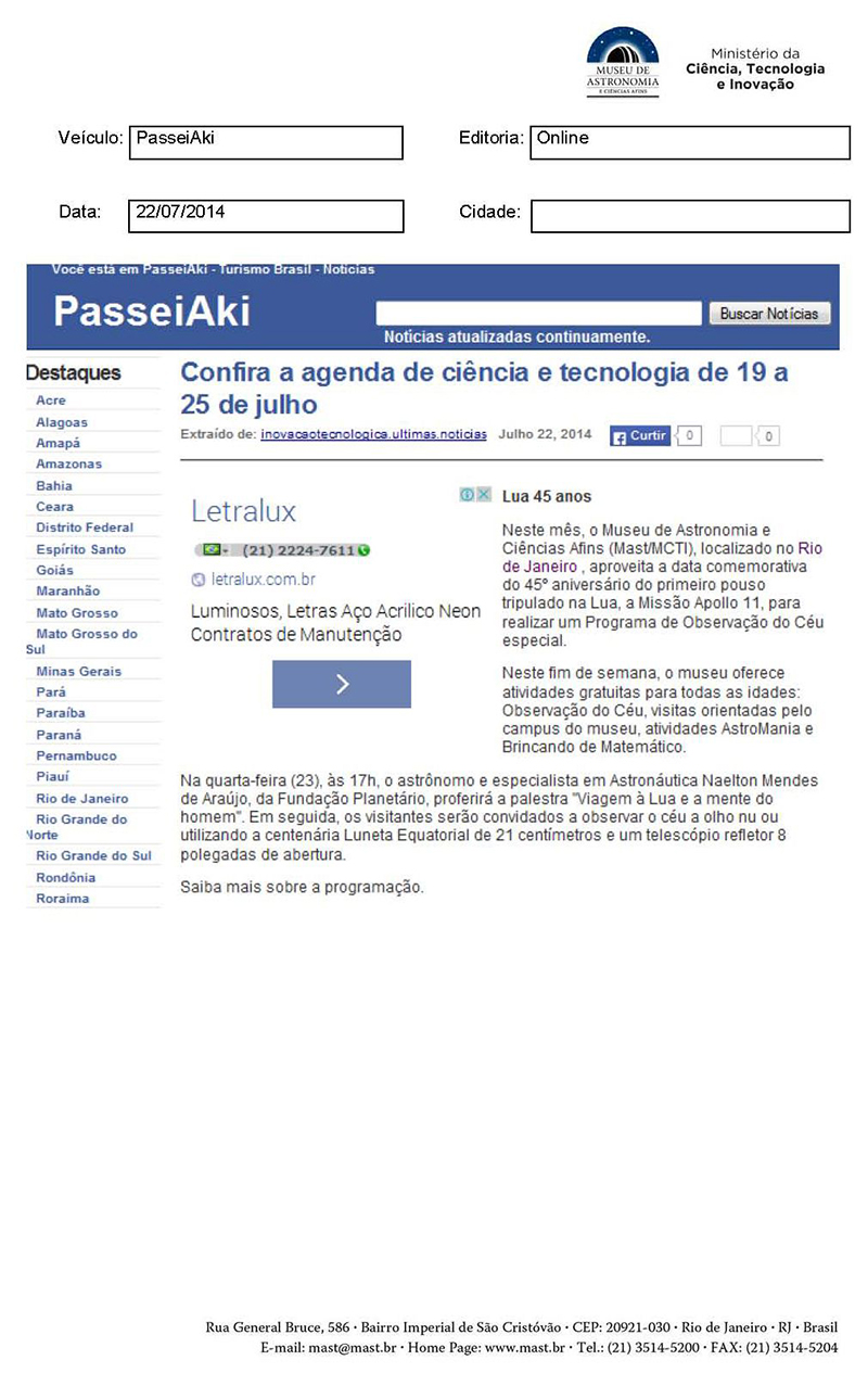 PasseiAki | Confira a agenda de ciência e yecnologia de 19 a 25 de julho