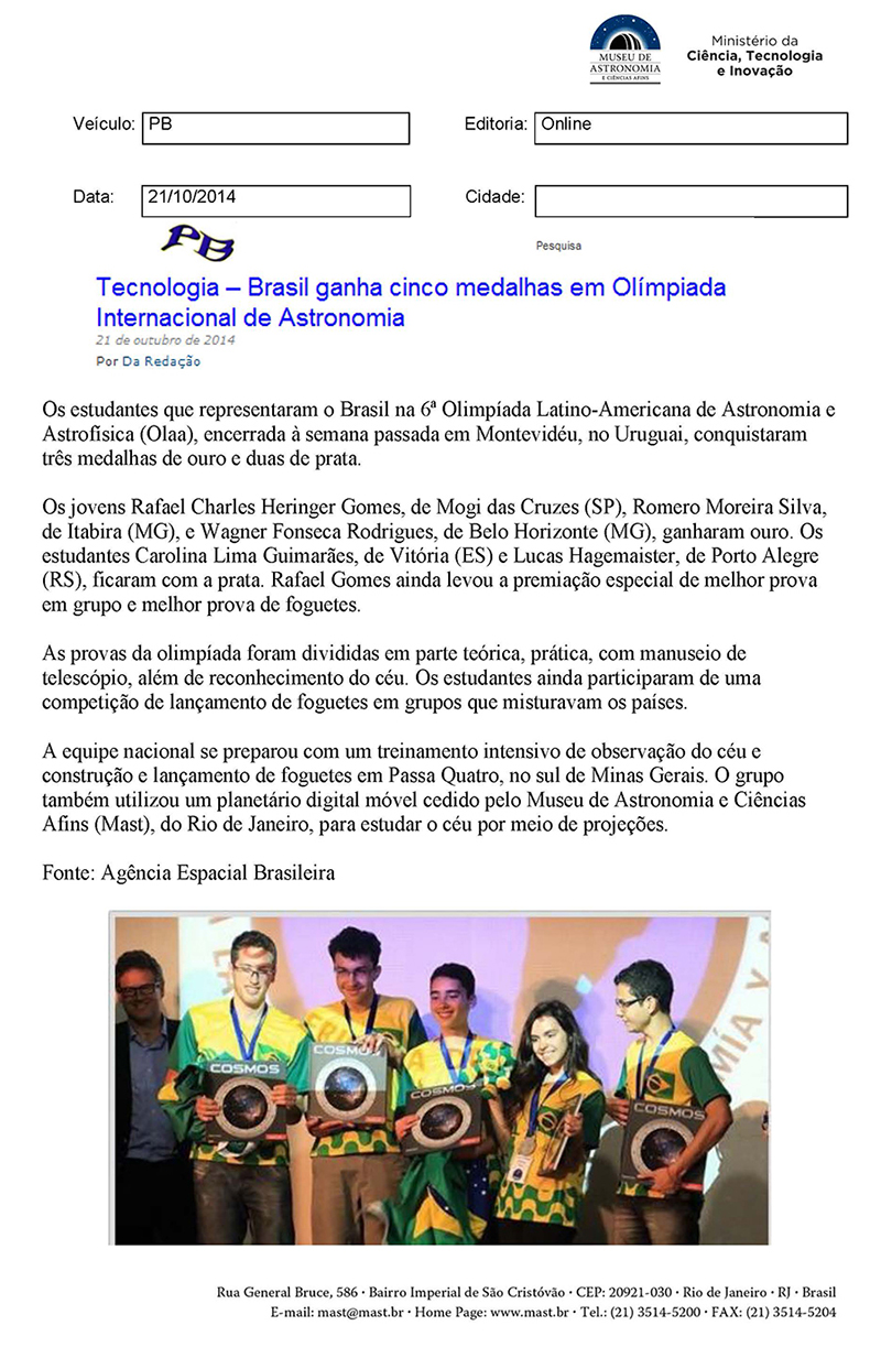 PB | Tecnologia - Brasil ganha cinco medalhas em Olimpíada Internacional de Astronomia