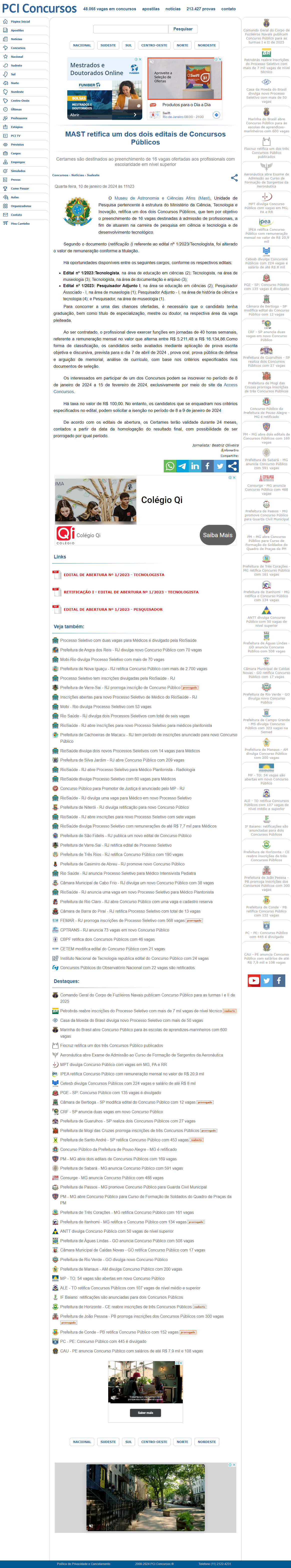 PCI Concursos - MAST retifica um dos dois editais de Concursos Públicos