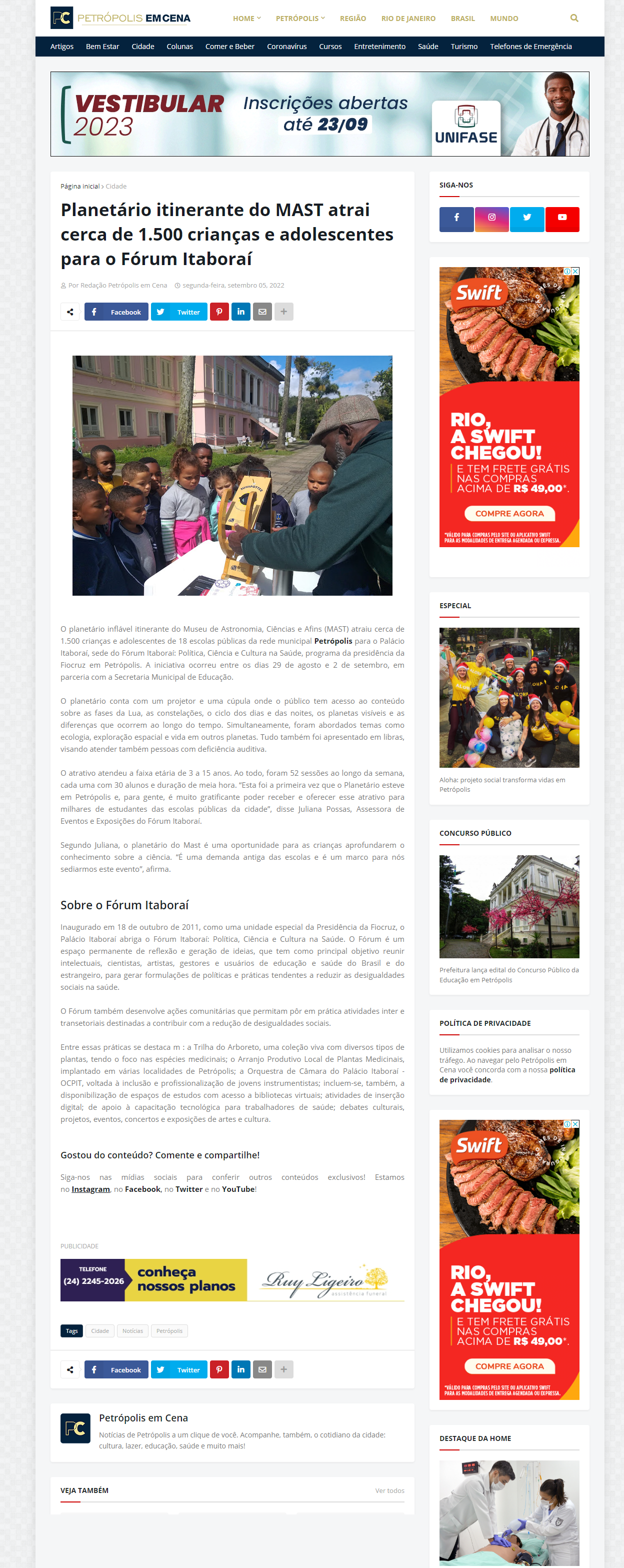 Petrópolis Em Cena - Planetário itinerante do Museu de Astronomia, Ciências e Afins atrai cerca de 1.500 crianças e adolescentes para o Fórum Itaboraí
