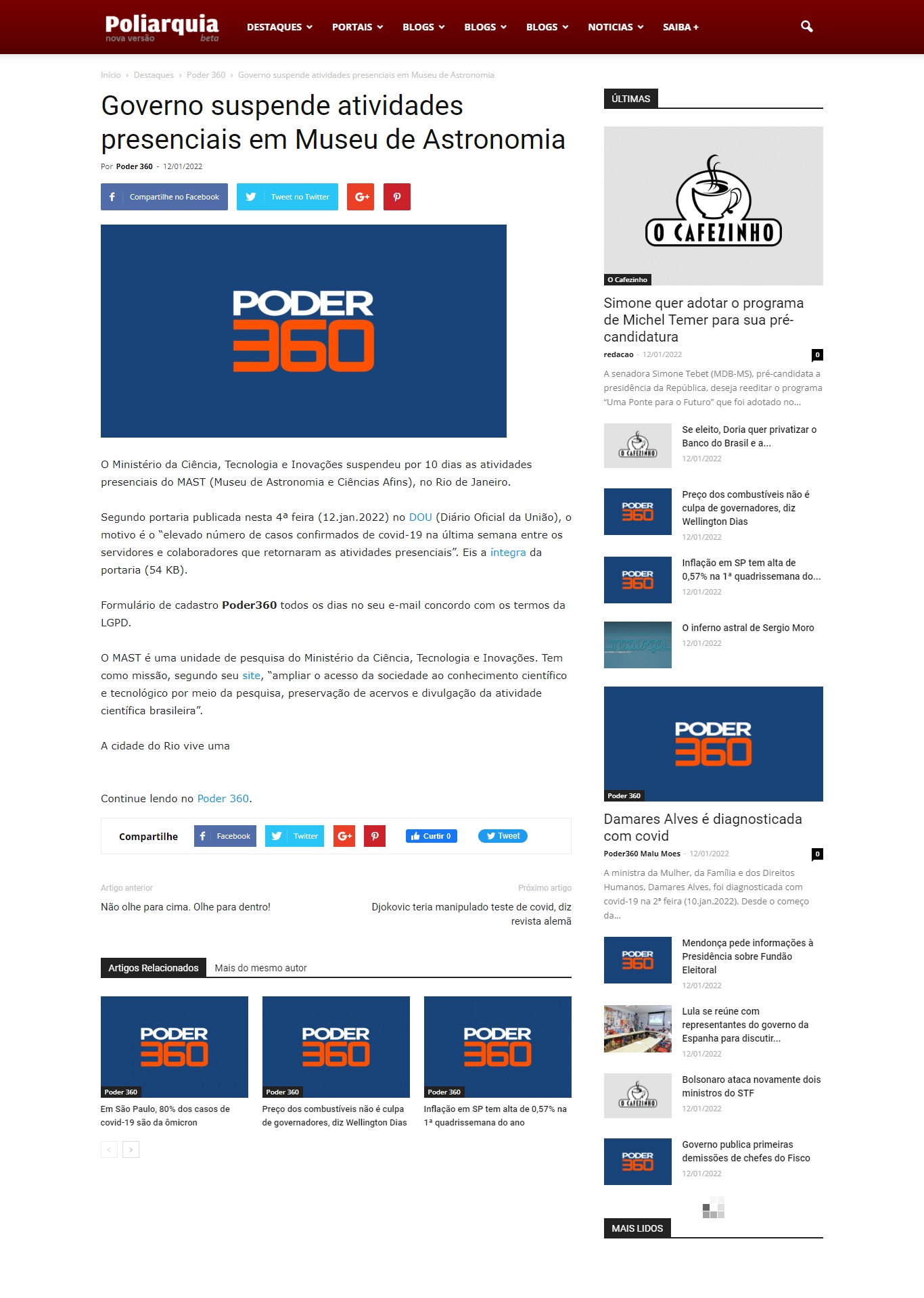 Poliarquia - Governo suspende atividades presenciais em Museu de Astronomia