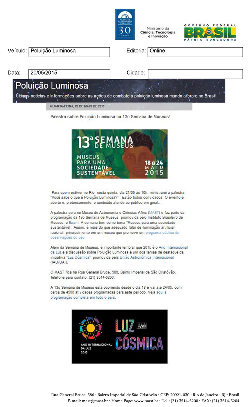 Poluição Luminosa | Palestra sobre Poluição Luminosa na 13ª Semana de Museus