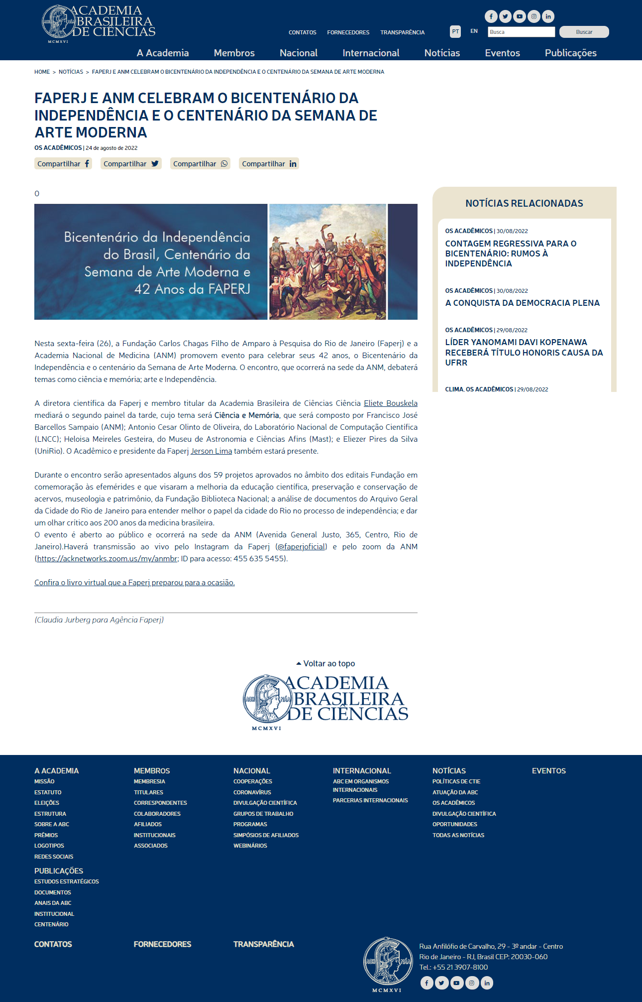 Portal ABC (Academia Brasileira de Ciências) - MAST na reportagem "FAPERJ e ANM celebram o Bicentenário da Independência e o Centenário da Semana de Arte Moderna"