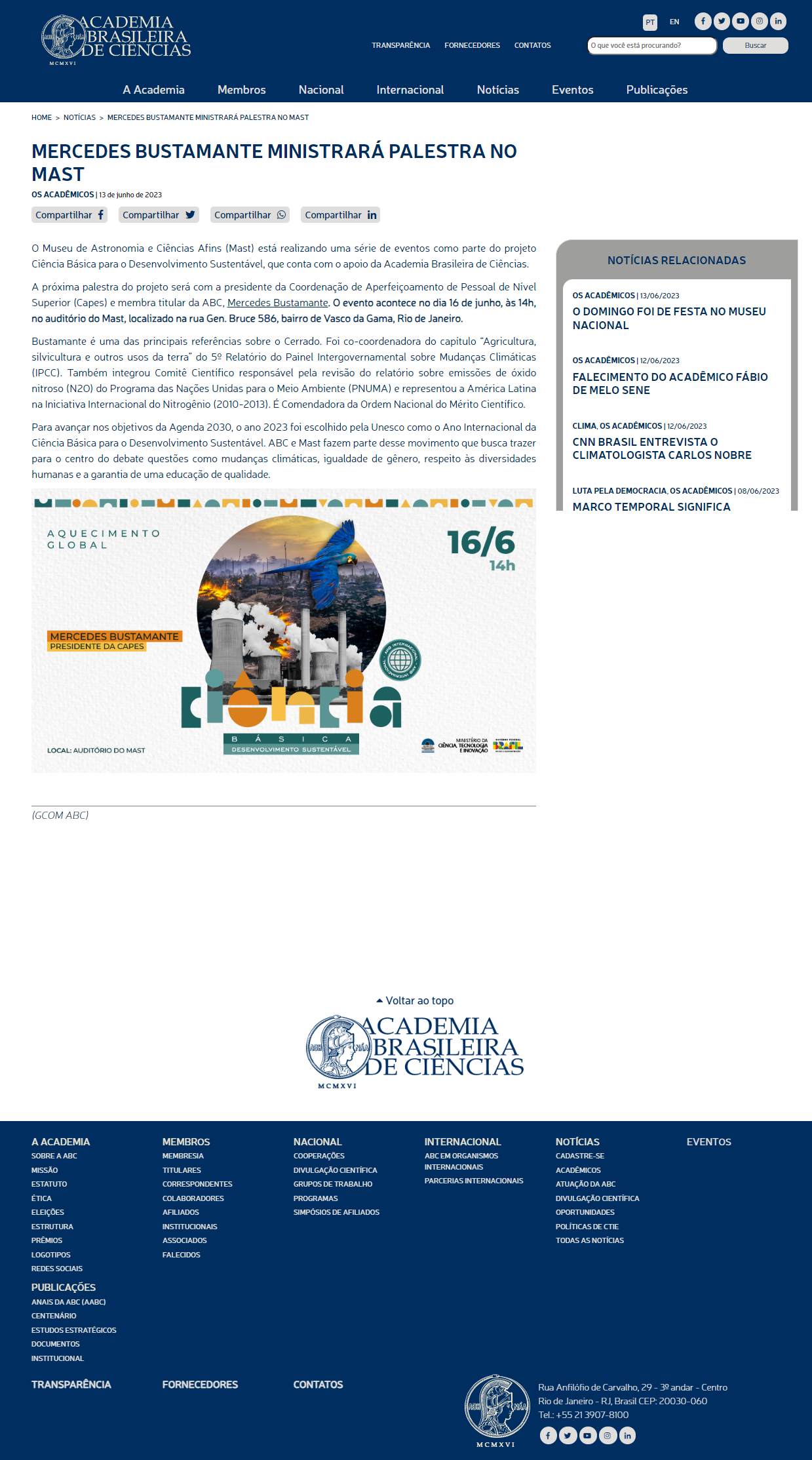 Portal Academia Brasileira de Ciências (ABC) - Mercedes Bustamante ministrará palestra no MAST