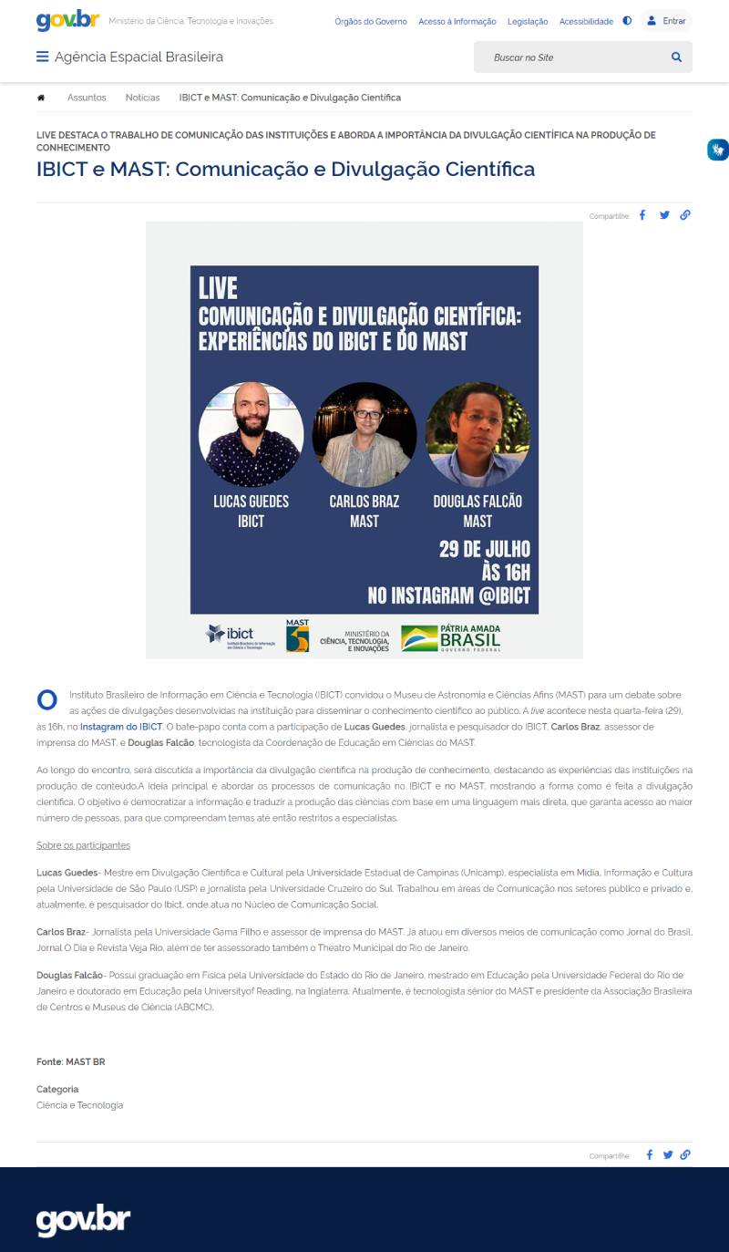 Portal AEB / Agência Espacial Brasileira | MAST participa de live promovida pelo Ibict sobre Comunicação e Divulgação Científica