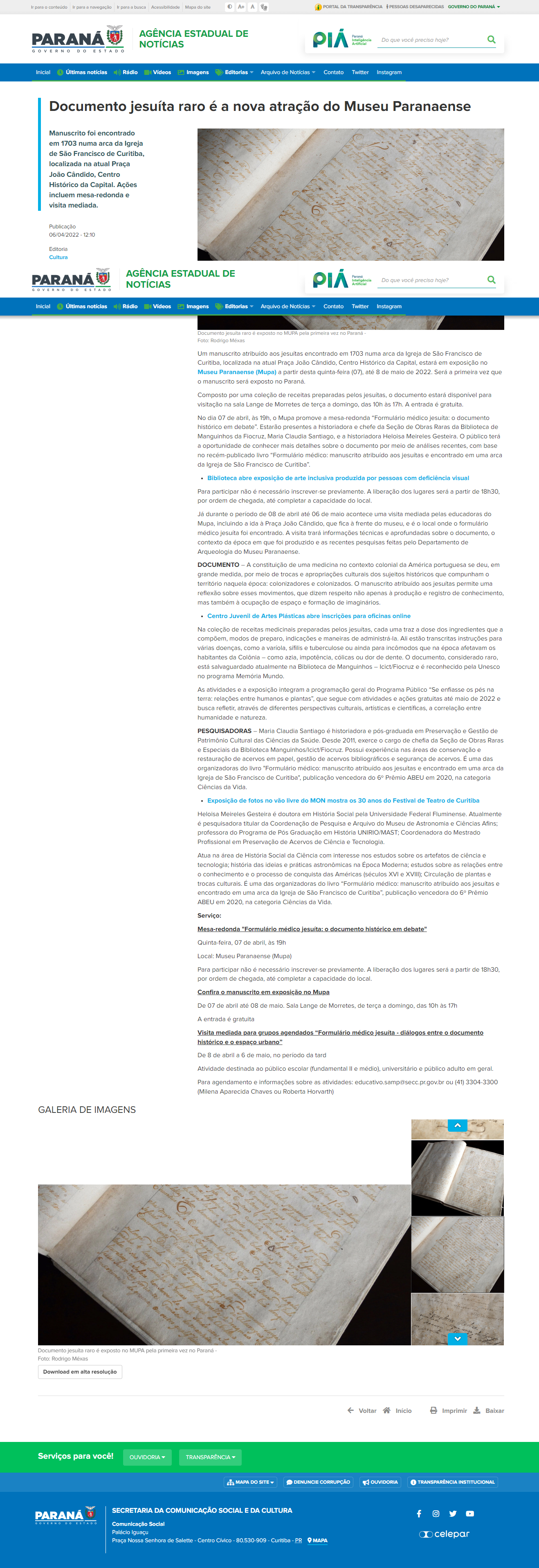 Portal Agência de Notícias do Paraná - Historiadora do MAST participa de mesa-redonda sobre raro documento jesuíta no Museu Paranaense (MUPA)
