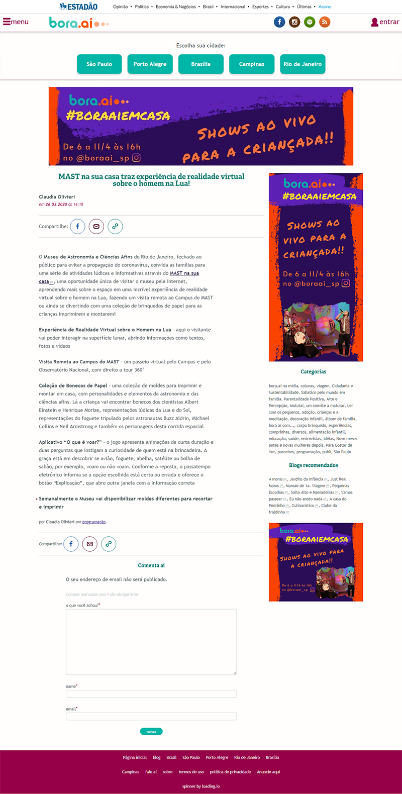 Portal Bora.Aí / Estadão - MAST disponibiliza visita virtual e aplicativo ‘O Que É Voar?’