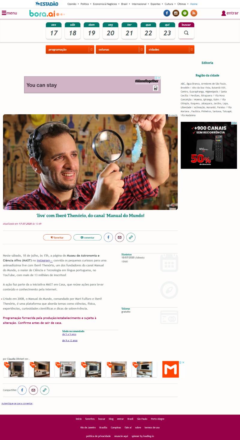Portal Bora.Aí / Estadão | MAST Em Casa vai apresentar live com Iberê Thenório, do canal Manual do Mundo