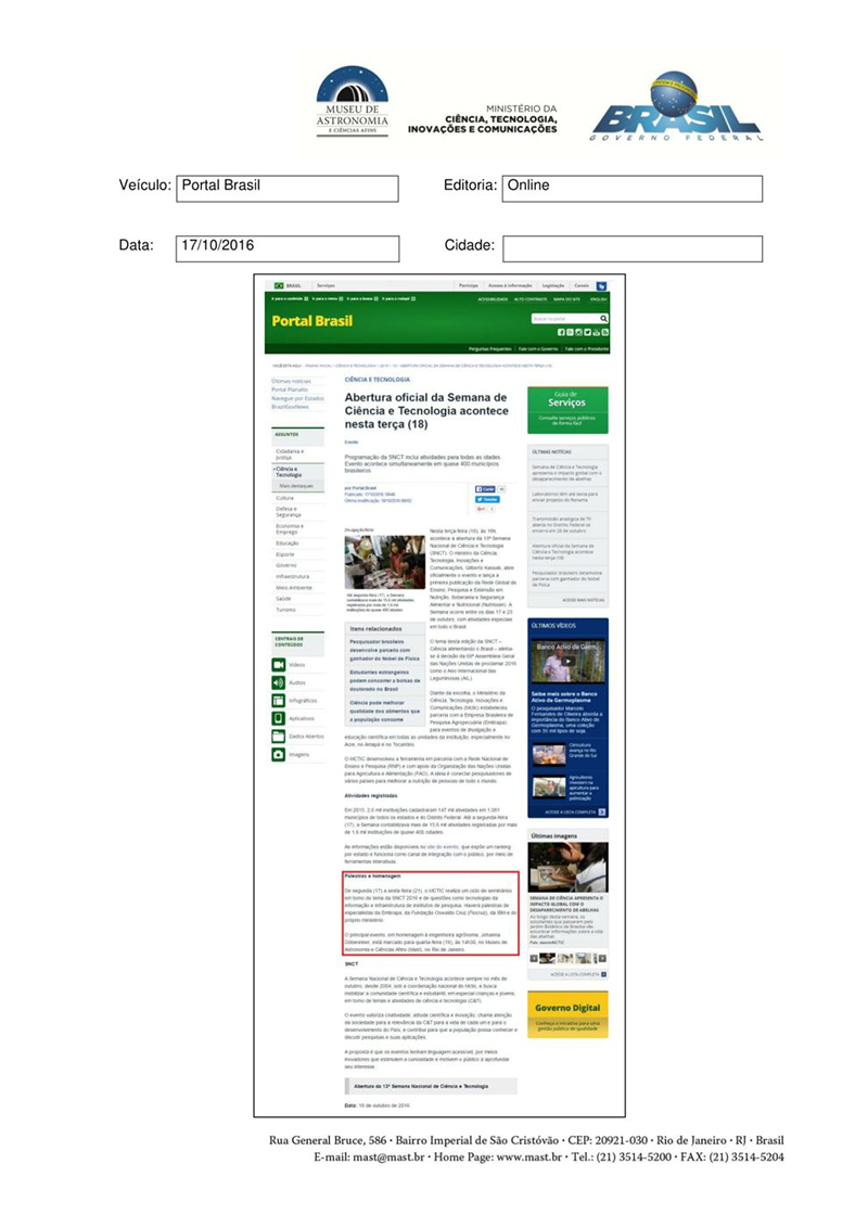 Portal Brasil | Abertura oficial da Semana de Ciência e Tecnologia acontece nesta terça (18)