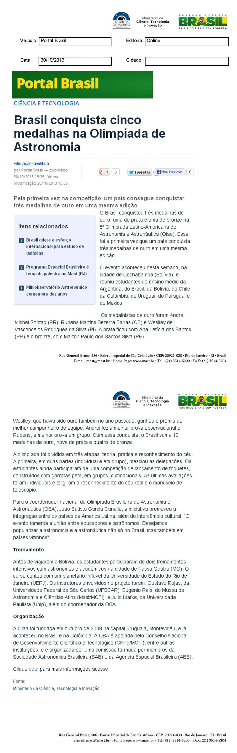Portal Brasil | Brasil conquista cinco medalhas na Olimpíada de Astronomia