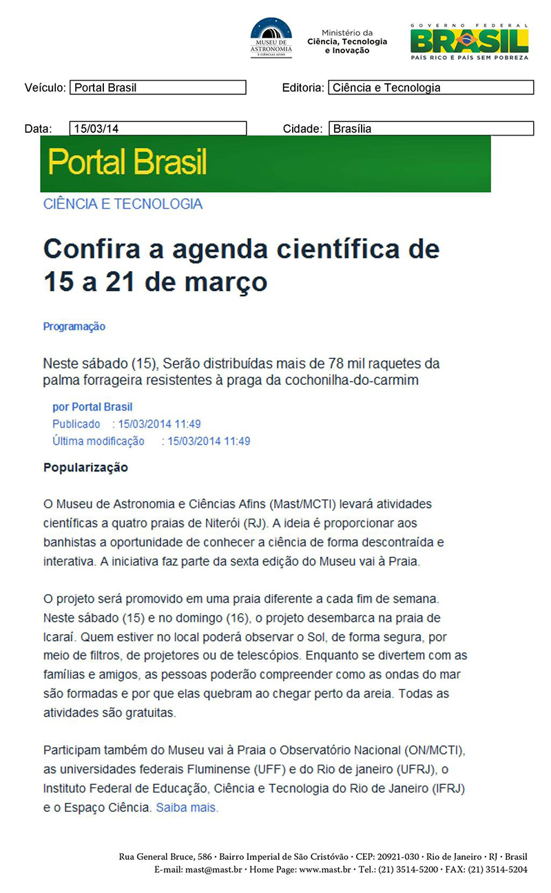 Portal Brasil | Confira a agenda científica de 15 a 21 de março