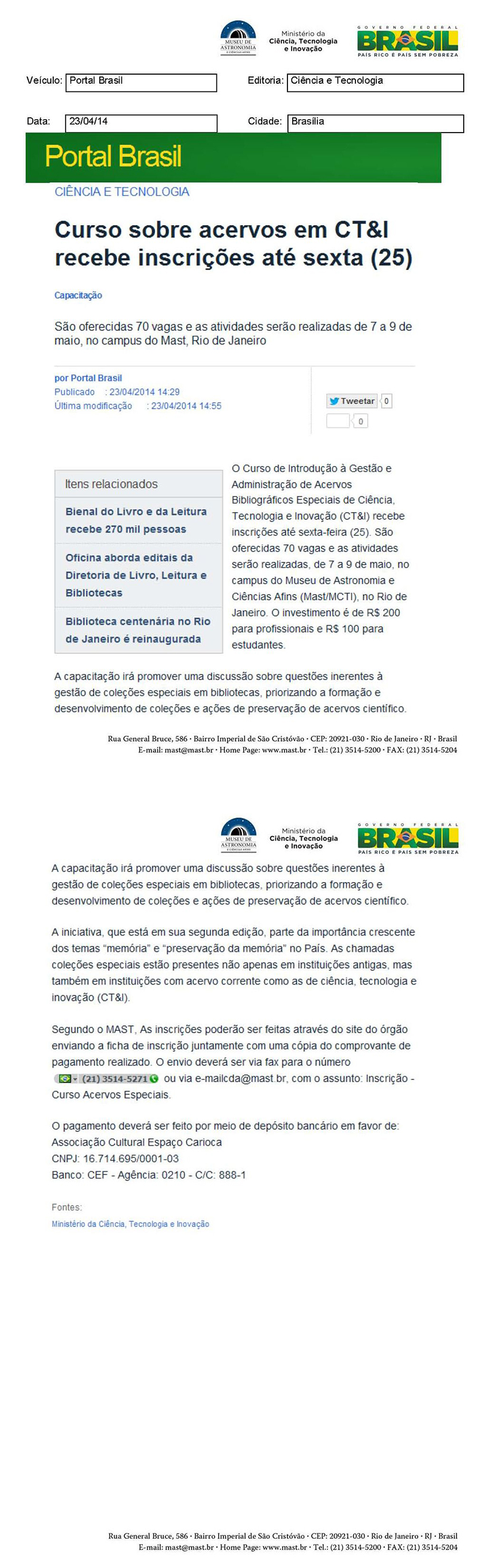 Portal Brasil | Curso sobre acervos em CT&I recebe inscrições até sexta (25)