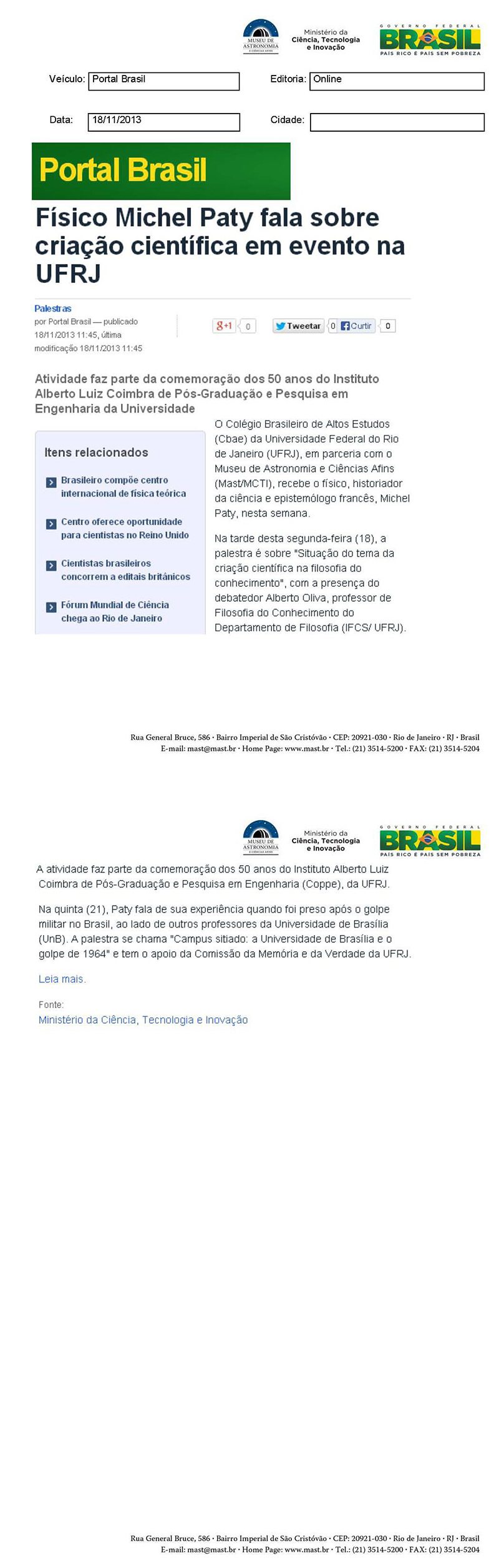Portal Brasil | Físico Michel Paty fala sobre criação científica em evento na UFRJ
