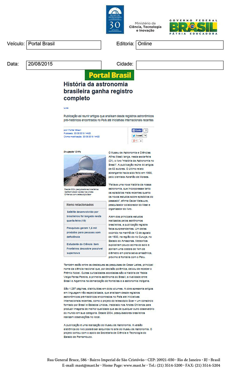 Portal Brasil | História da astronomia brasileira ganha registro completo