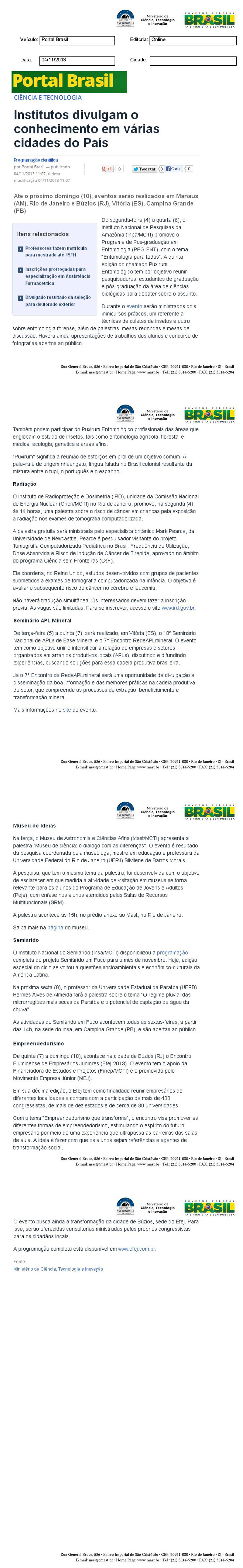 Portal Brasil | Institutos divulgam o conhecimento em várias cidades do País