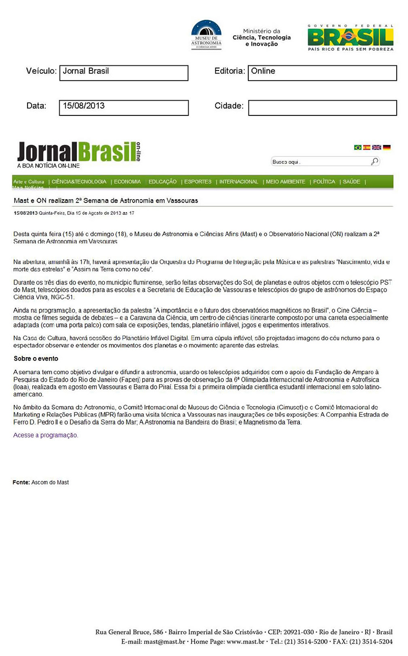 Portal Brasil | MAST e ON realizam 2ª Semana de Astronomia em Vassouras