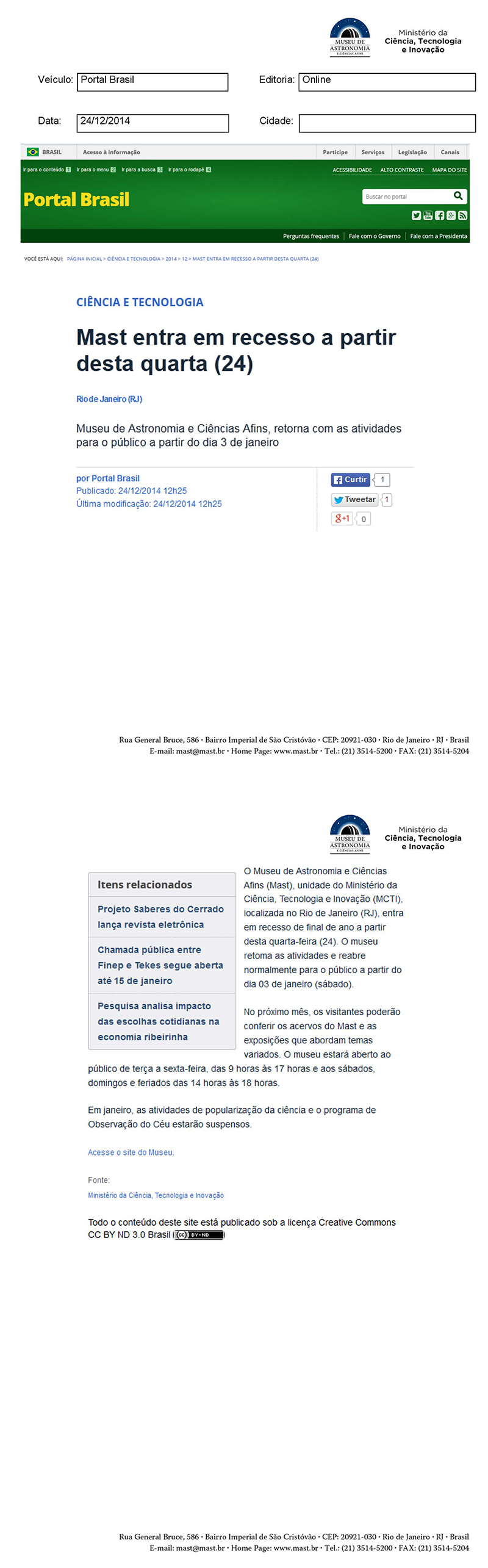 Portal Brasil | MAST entra em recesso a partir desta quarta (24)