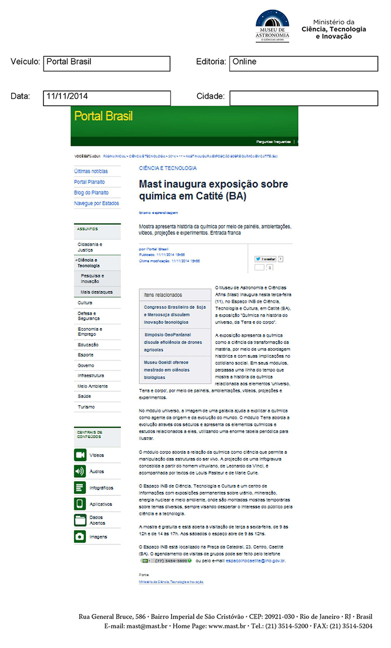 Portal Brasil | MAST inaugura exposição sobre química em Caetité (BA)