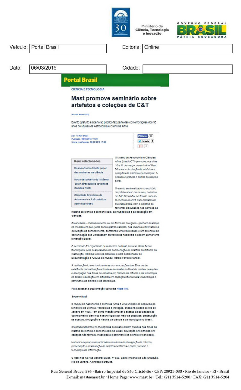 Portal Brasil | MAST promove seminário sobre artefatos e coleções de ciência e tecnologia