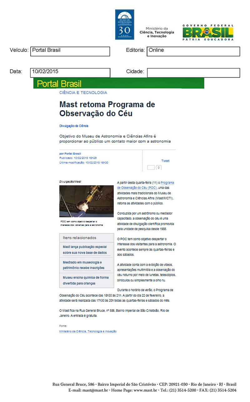 Portal Brasil | MAST retoma Programa de Observação do Céu