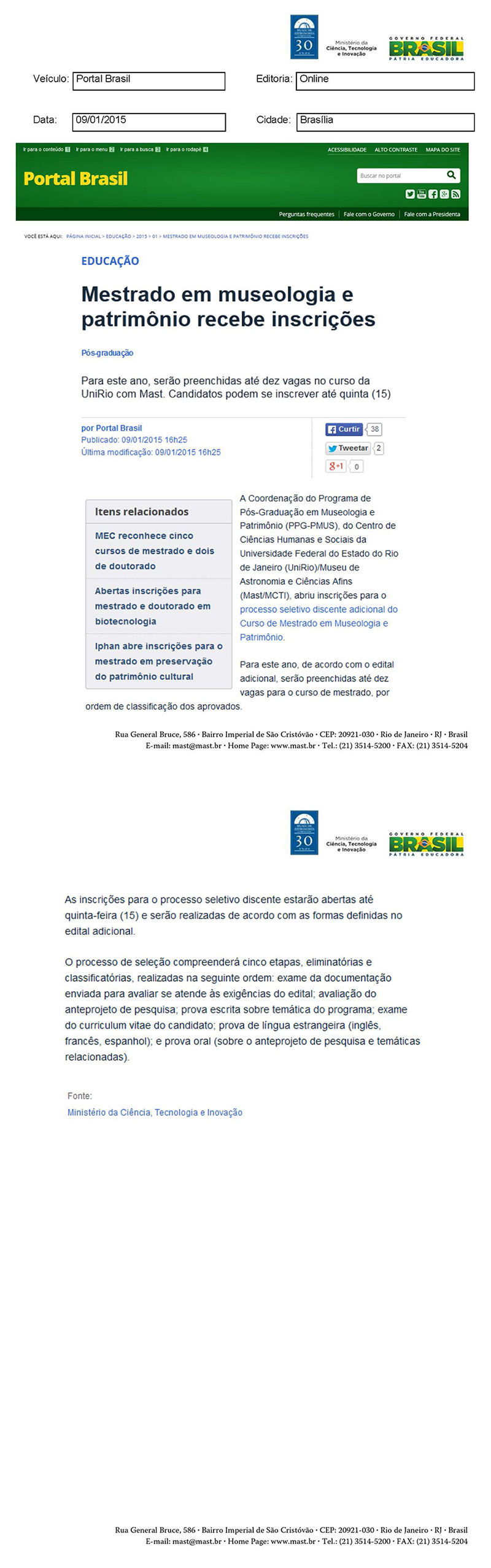 Portal Brasil | Mestrado em museologia e patrimônio recebe inscrições