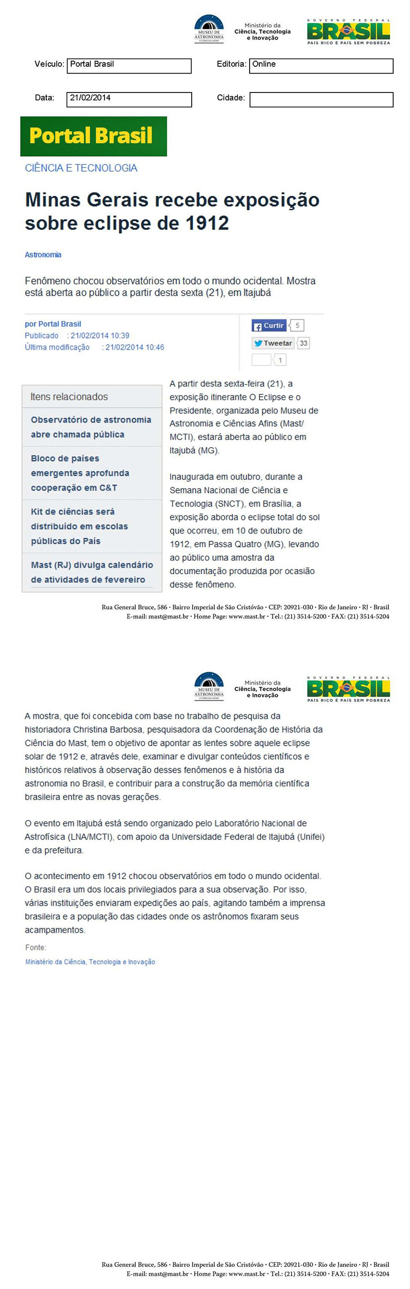 Portal Brasil | Minas Gerais recebe exposição sobre eclipse de 1912