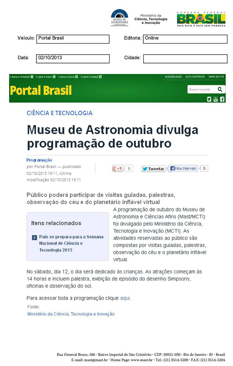 Portal Brasil | Museu de Astronomia divulga programação de outubro