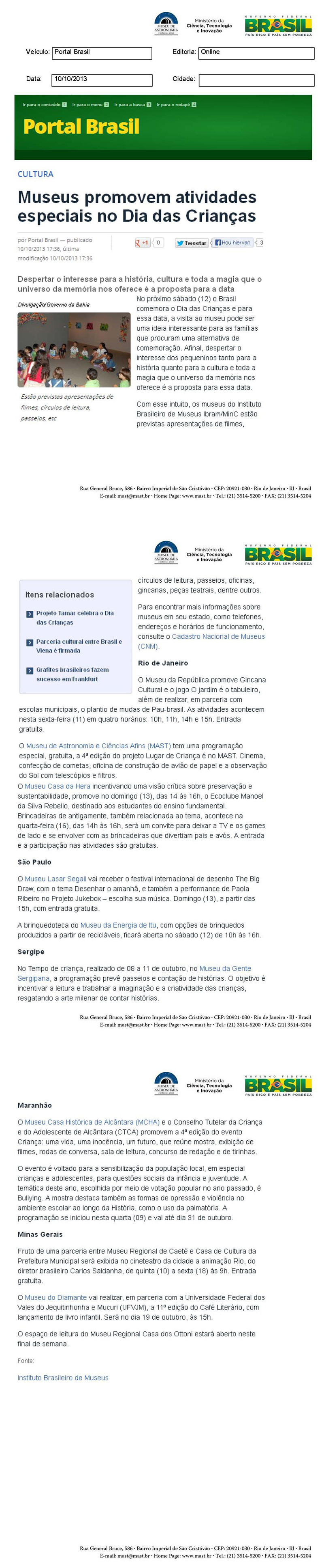 Portal Brasil | Museus promovem atividades especiais no Dia das Crianças