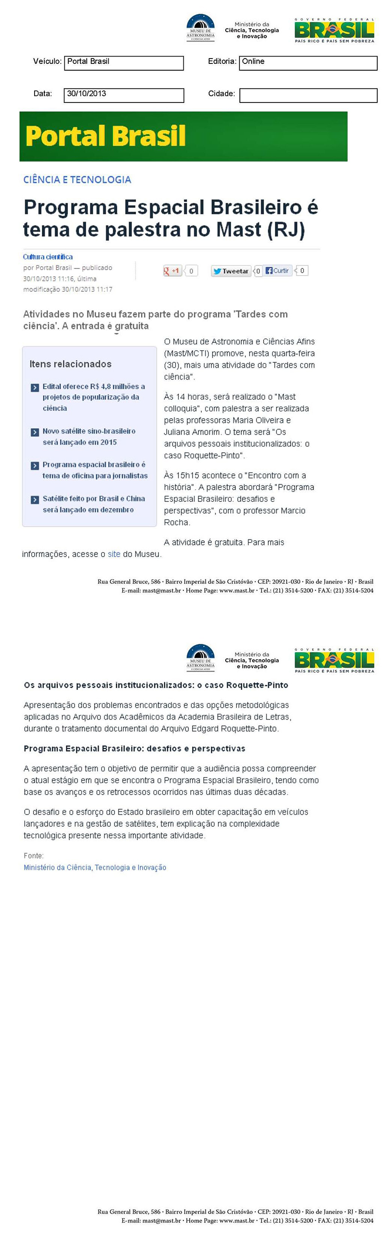 Portal Brasil | Programa Espacial Brasileiro é tema de palestra no MAST (RJ)
