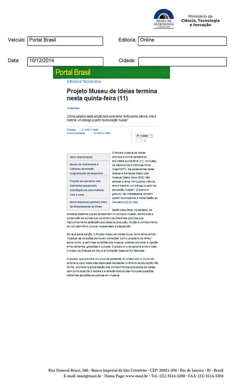 Portal Brasil | Projeto Museu de Ideias termina nesta quinta-feira (11)