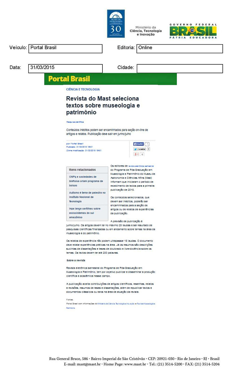 Portal Brasil | Revista do MAST seleciona textos sobre museologia e patrimônio