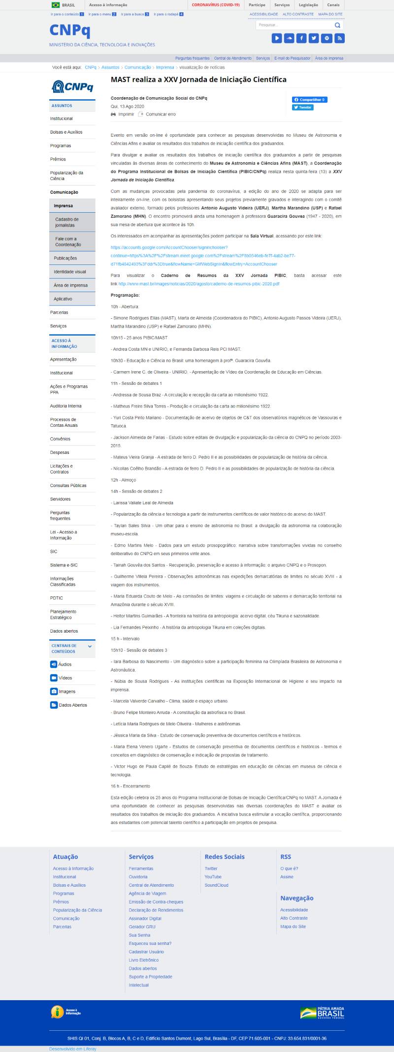 Portal CNPq | MAST realiza a XXV Jornada de Iniciação Científica