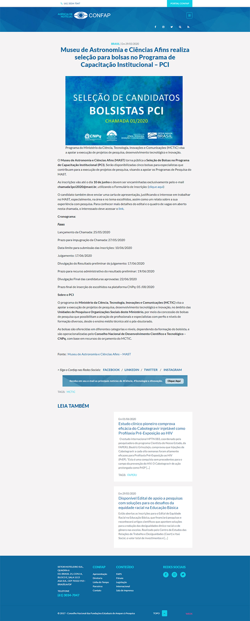 Portal CONFAP – Confederação das Fundações de Amparo à Pesquisa | MAST realiza seleção para bolsas no Programa de Capacitação Institucional – PCI