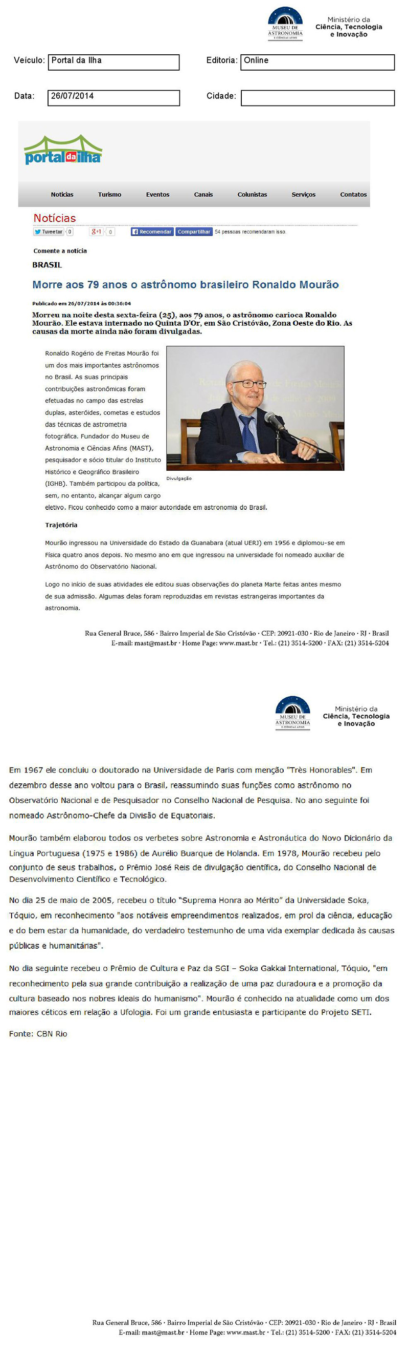 Portal da Ilha | Morre aos 79 anos, o grande astrônomo Ronaldo Mourão