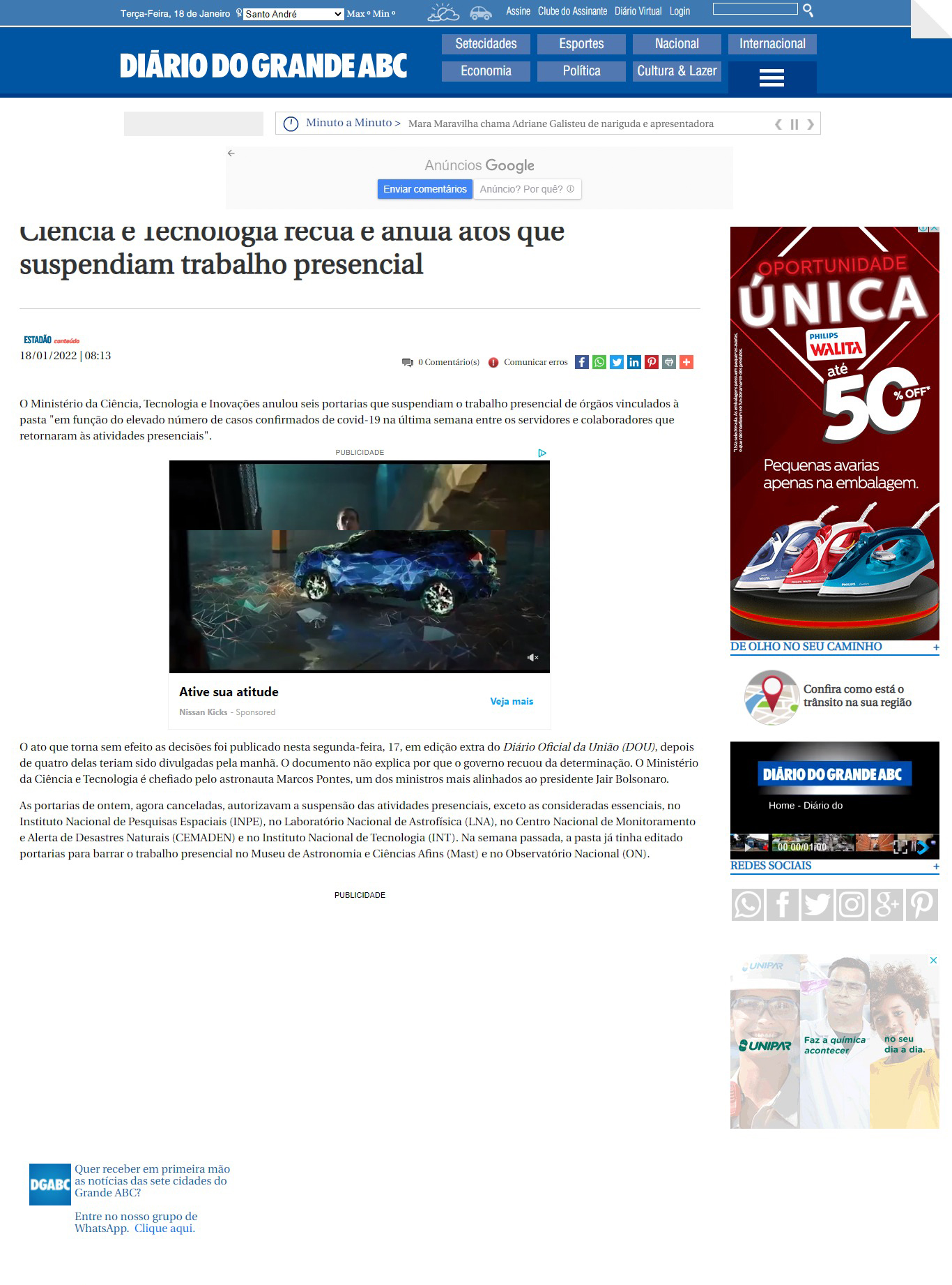 Portal Diário do Grande ABC - MAST na reportagem 'Ciência e Tecnologia recua e anula atos que suspendiam trabalho presencial'