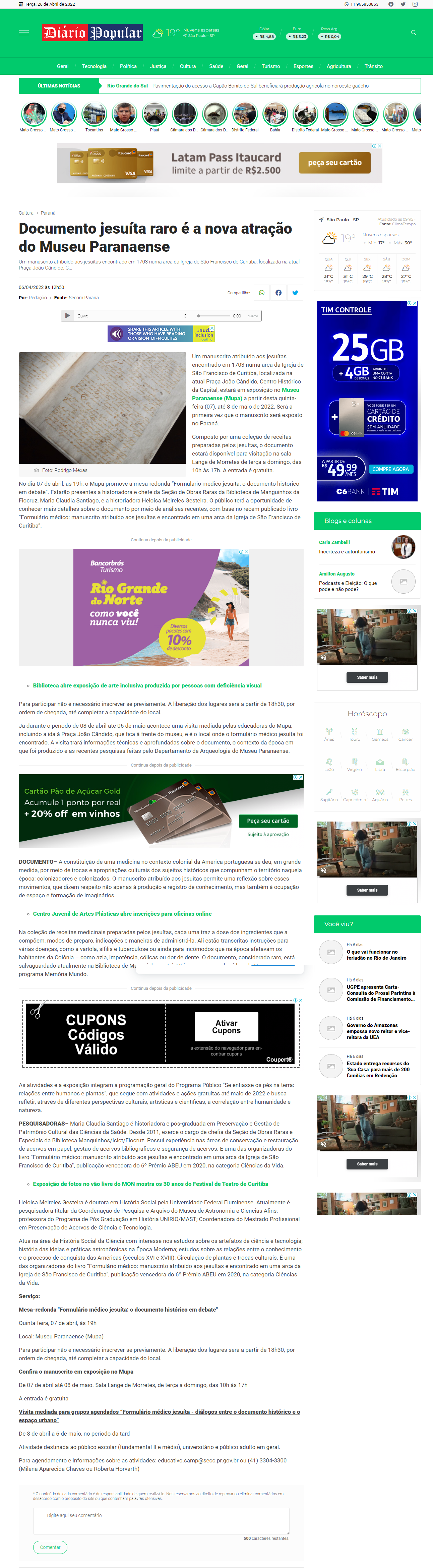 Portal Diário Popular do Brasil (São Paulo-SP) - Historiadora do MAST participa de mesa-redonda sobre raro documento jesuíta no Museu Paranaense (MUPA)