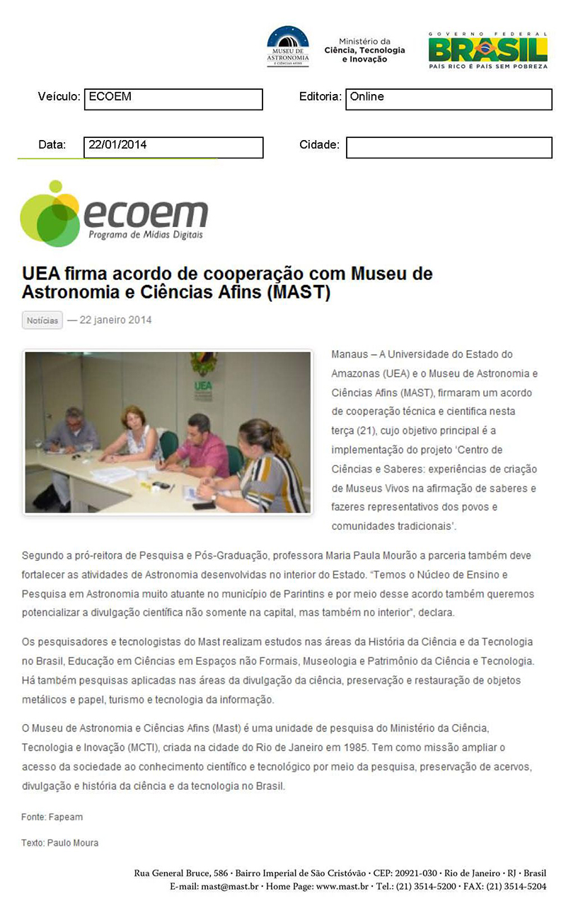 Portal ecoem | UEA firma acordo de cooperação com Museu de Astronomia e Ciências Afins (MAST)