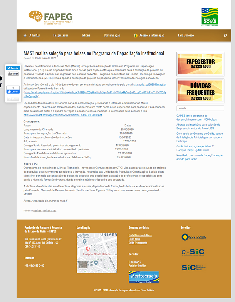 Portal FAPEG - Fundação de Amparo à Pesquisa de Goiás | MAST realiza seleção para bolsas no Programa de Capacitação Institucional – PCI