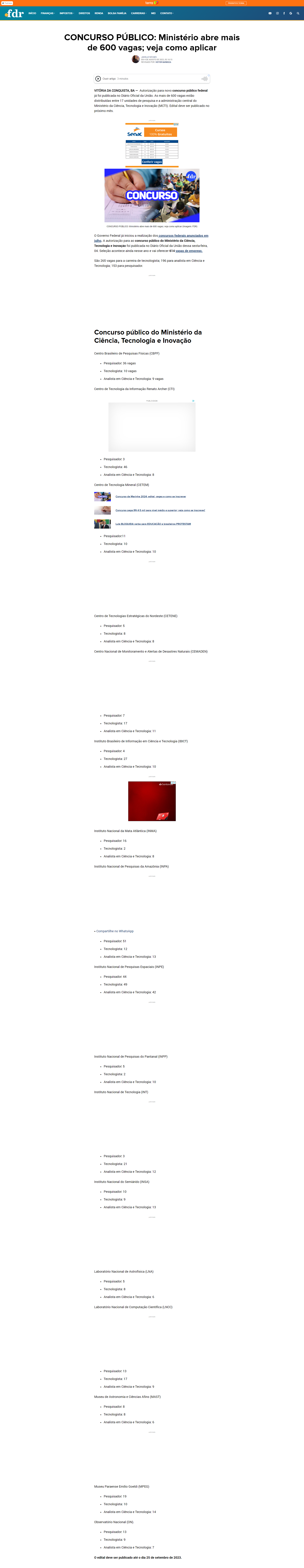 Portal fdr / Terra - Concurso Público: Ministério abre mais de 600 vagas; veja como aplicar
