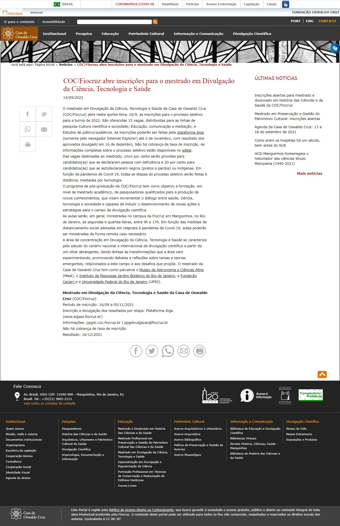 Portal Fiocruz - COC/Fiocruz abre inscrições para o mestrado em Divulgação da Ciência, Tecnologia e Saúde, em parceria com o MAST