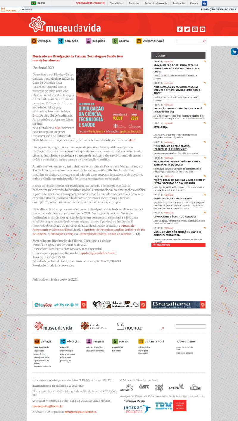Portal Fiocruz/Museu da Vida | Mestrado em Divulgação da Ciência, Tecnologia e Saúde tem inscrições abertas