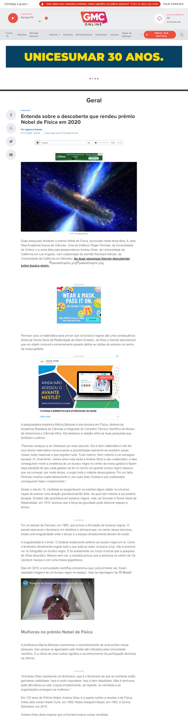 Portal GMC on-line (Maringá-PR) | MAST na reportagem "Entenda sobre a descoberta que rendeu prêmio Nobel de Física em 2020"